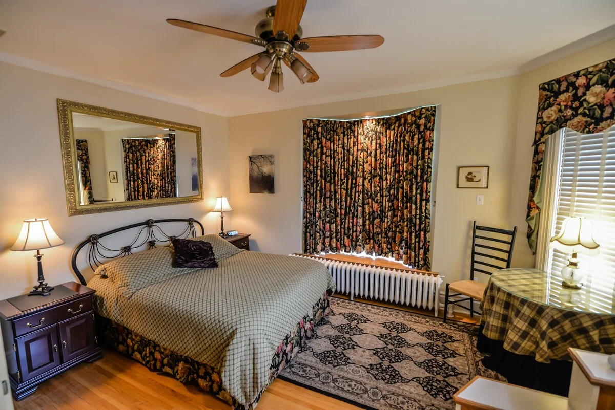 The Rectory’s off-site option offers the greatest privacy and space. This gorgeous house is a peaceful 3-minute walk around the corner from The Old Rectory. Built in 1879, the house has been faithfully renovated to maintain its historic beauty and charm, with original pine flooring, wooden panel doors and sash windows. It is spacious, bathed in natural light, and offers comfortable modern living, including a bathroom with in-floor heating and a large shower, a well-equipped, bright kitchen, and a generous front porch. There is also high-speed wi-fi and private off-street parking for two cars in front of the house. There are 2 bedrooms upstairs, each with a queen-size bed, and a shared bathroom.